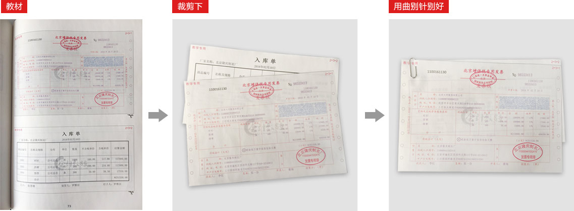 第一步:会计教练给您准备了全套实操的单据、账本、封皮、包角、针线。打开教材,把教材中原始凭证按照裁剪线(我们有剪刀专门标注)裁剪下来。按照经济业务的序号把每一笔经济业务对应的原始凭证用曲别针别好。