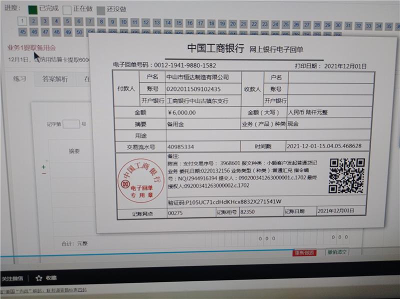 回答领取现金支票这个是在柜台办理的,我看这个业务没有表示是网银办理的,这个是提取备用金之后,银行存款减少的业务回单。