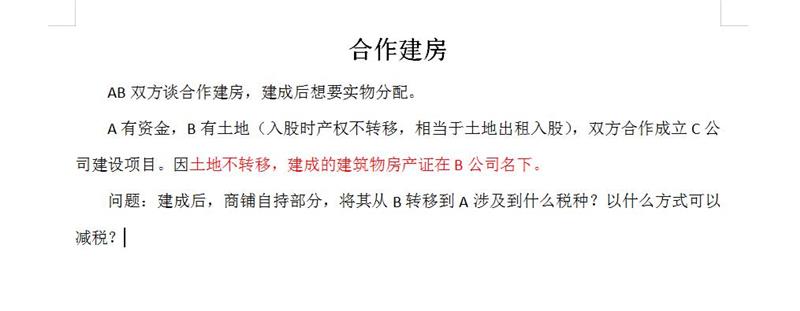 追问AB双方谈合作建房,建成后想要实物分配。 A有资金,B有土地(入股时产权不转移,相当于土地出租入股),双方合作成立C公司建设项目。因土地不转移,建成的建筑物房产证在B公司名下。 问题:建成后,商铺自持部分,将其从B转移到A涉及到什么税种?以什么方式可以减税?