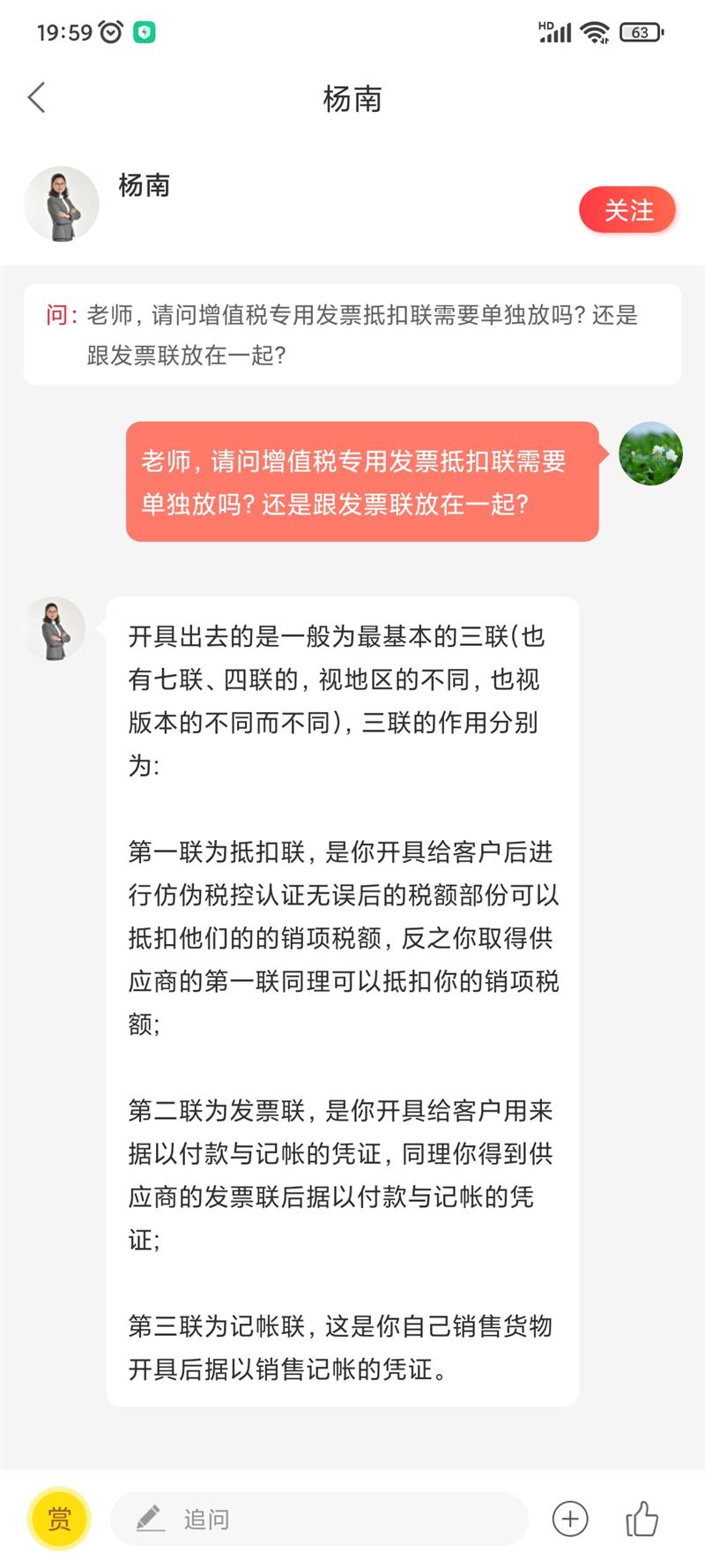 抵扣联可以单独装订,也是需要单独存放 。 发票联附在记账凭证后面的亲。