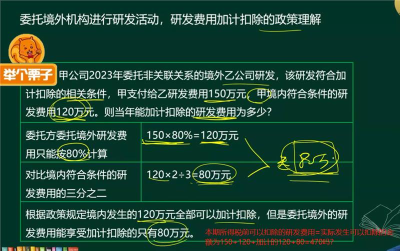 80是加计扣除计算的基数,如果是研发费用的话 是80*100%,形成无形资产的是80*200%=160 是150+120+120的加计扣除金额+80或者160的。