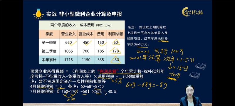 季度预交所得税是累计计算的,第二季度时是按照1-6月的累计利润减去亏额计算累计税额后再减去第一季度预交过的税额=本季度应交税额。