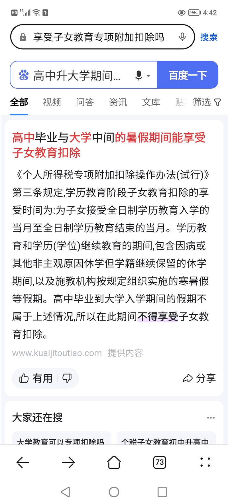1、对于连续性的学历(学位)教育,升学衔接期间属于子女教育期间,可以申报扣除子女教育专项附加扣除。【如】孩子6月高中毕业,9月上大学,7-8月能享受子女教育扣除