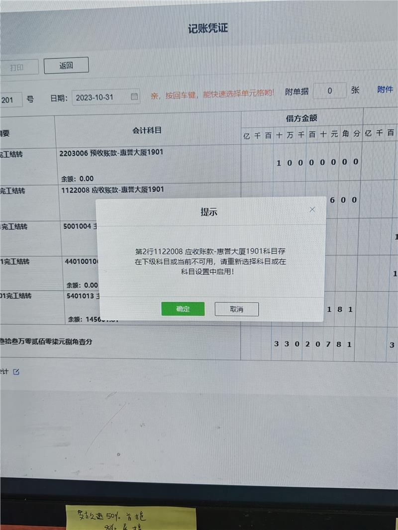 系统提示你们这个科目下还有明细科目,录入科目时需要选择最末级的明细科目的。