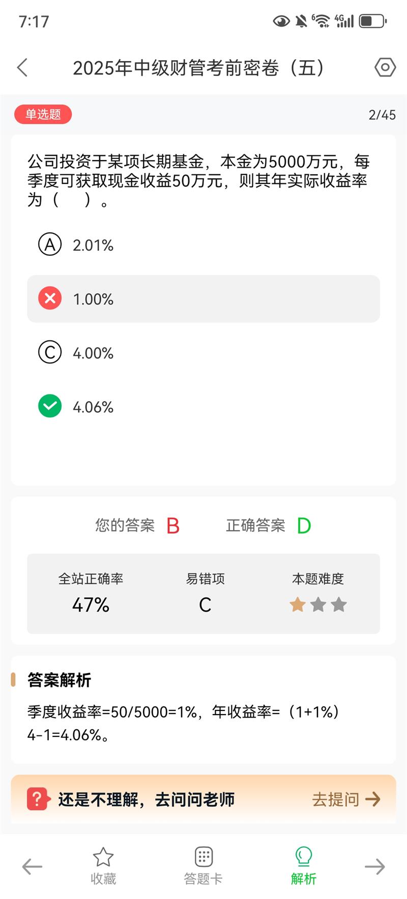 季度收益率为50/5000=1%。由于是按季度复利,年实际收益率需计算复利:(1+1%)^4-1=1.01^4-1≈1.0406-1=0.0406,即4.06%。