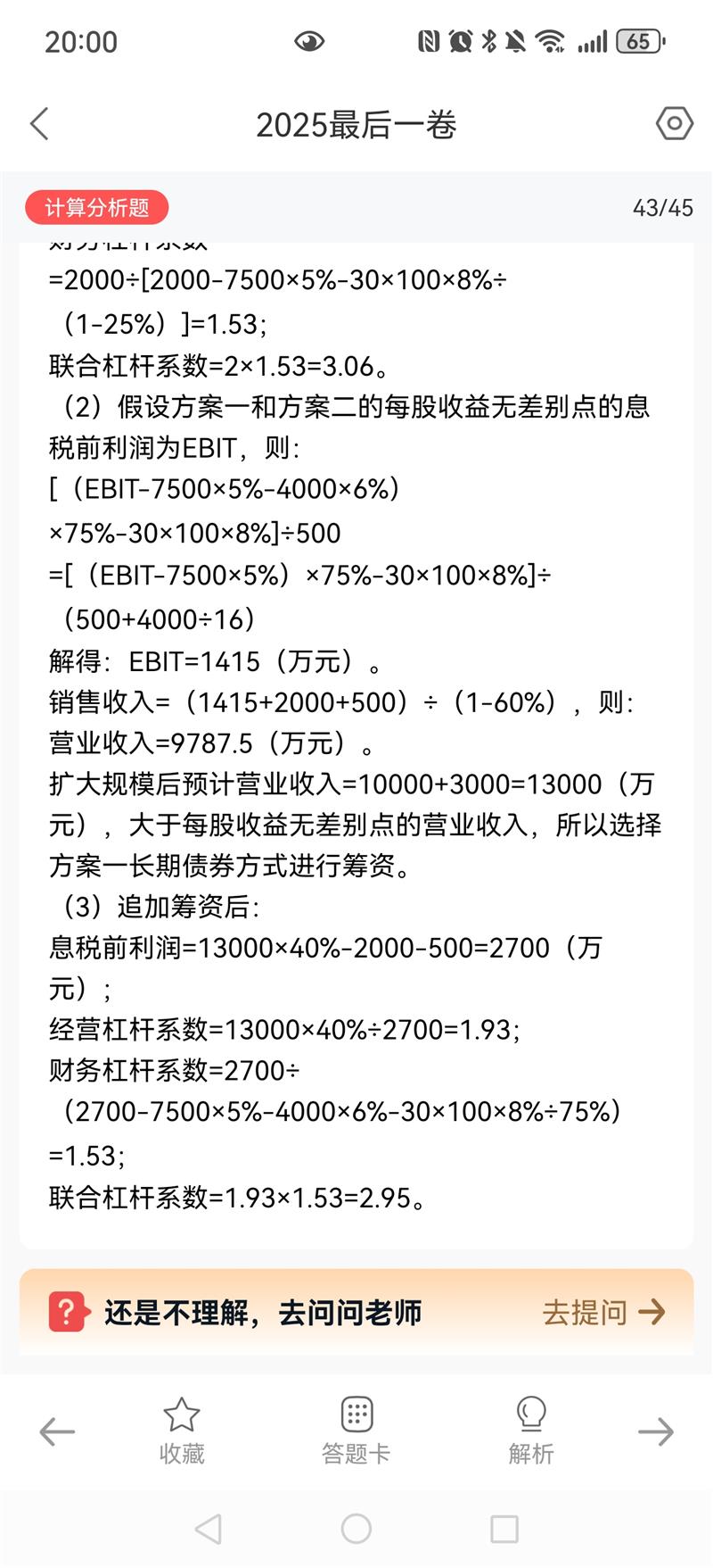 EBIT计算正确。根据题干数据:销售收入1亿元,变动成本率60%,除财务费用外的固定成本2000万元。 EBIT = 10000 × (1-60%) - 2000 = 4000 - 2000 = 2000万元。 计算过程无误。