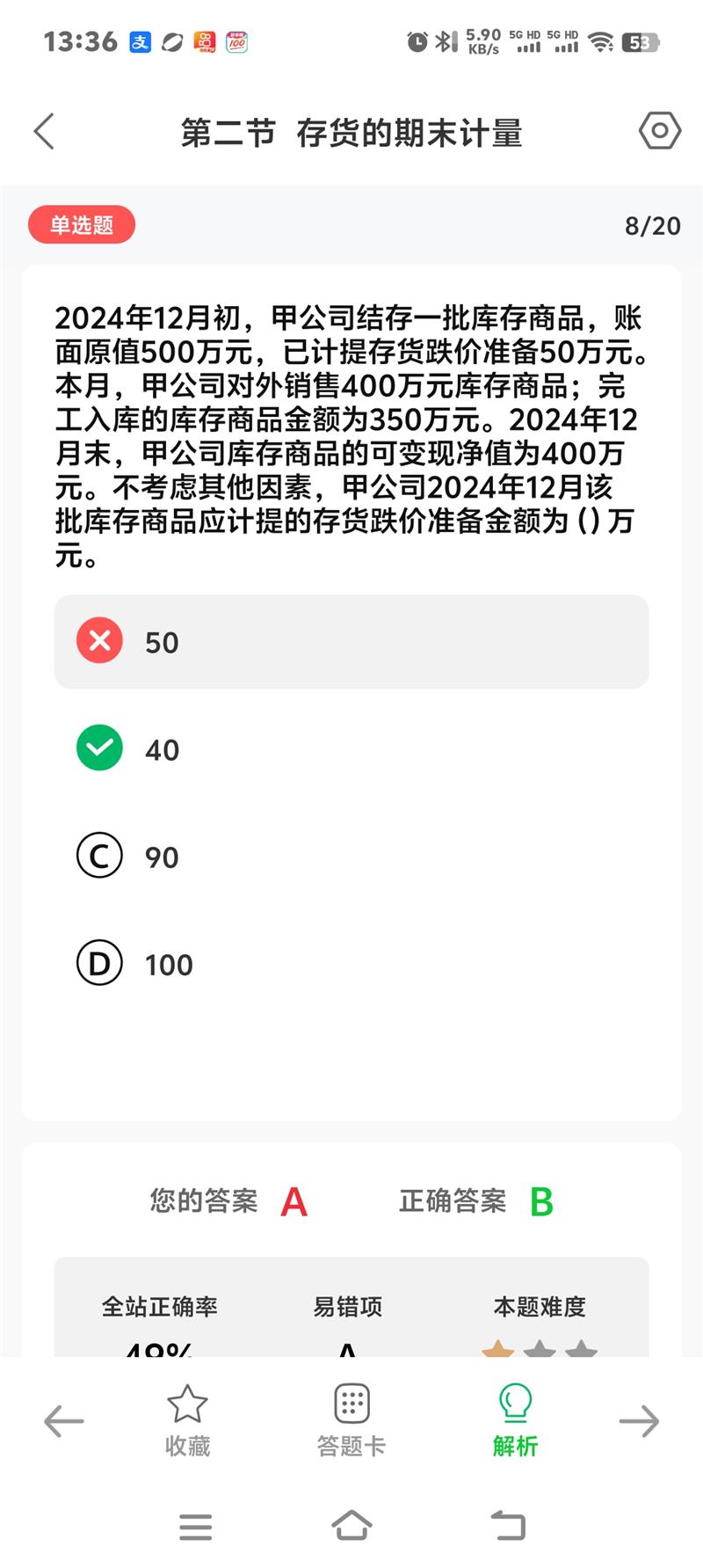 期初500万元 - 销售400万元 + 入库350万元 = 450万元