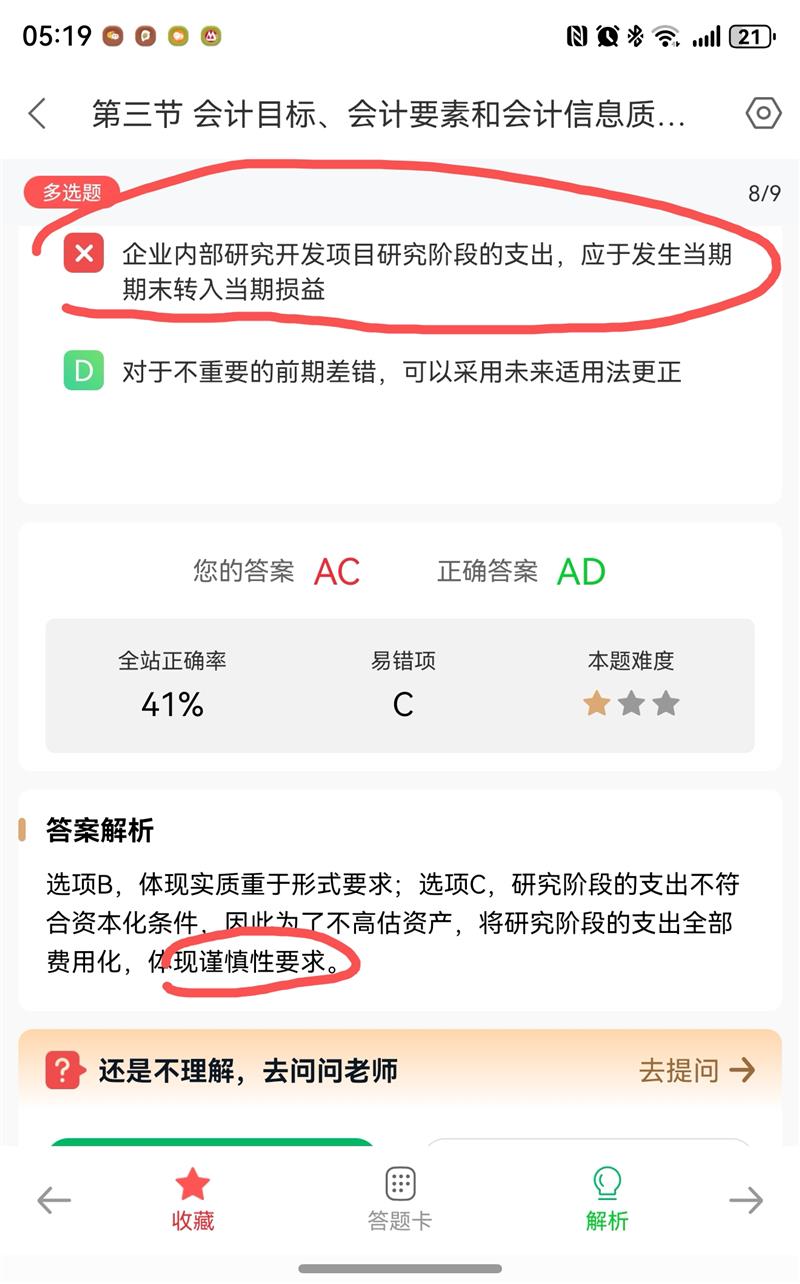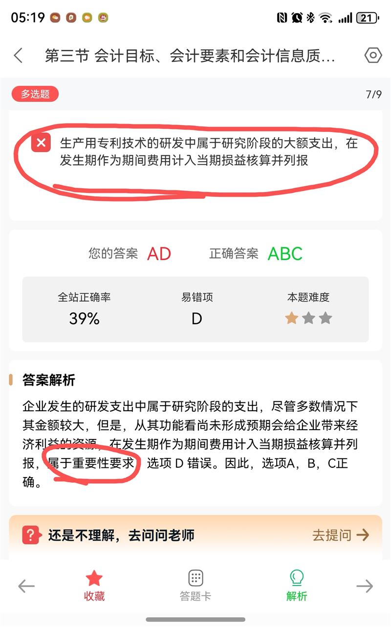 两道题涉及不同业务场景:前一题可能考察研究阶段费用化处理的谨慎性,本题考察小额支出和差错更正的重要性应用,需根据具体业务判断适用的原则。