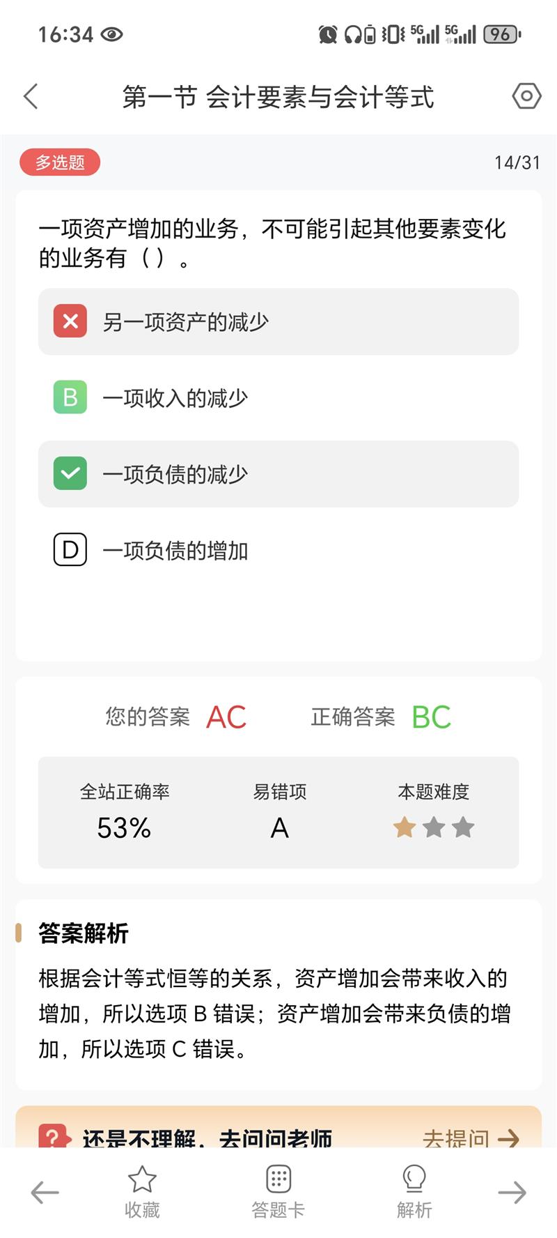 - B项收入的减少与资产增加无直接对应关系,资产增加通常关联收入增加或负债增加。