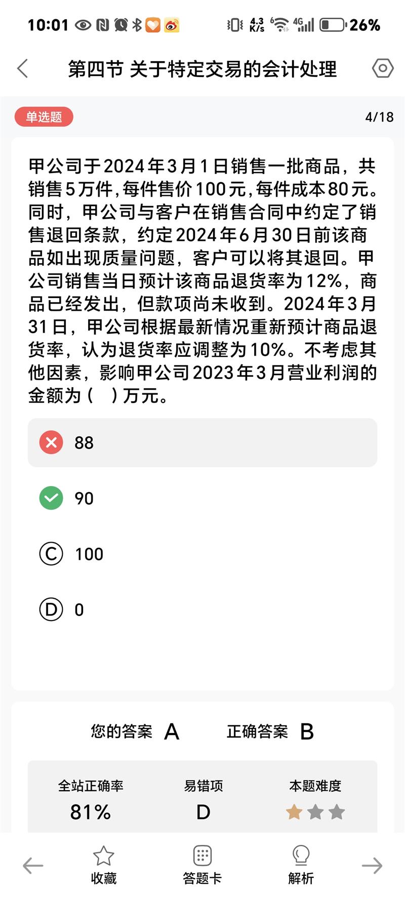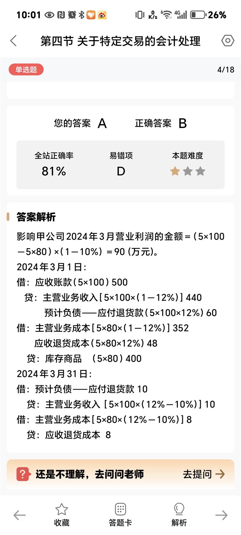 问(1)甲公司对外销售400万元库存商品:借:主营业务成本4000000贷:库存商品4000000借:存货跌价准备400000贷:主营业务成本400000甲公司该批库存商品的存货跌价准备余额=50-40=10(万元),这10万元的算法没明白