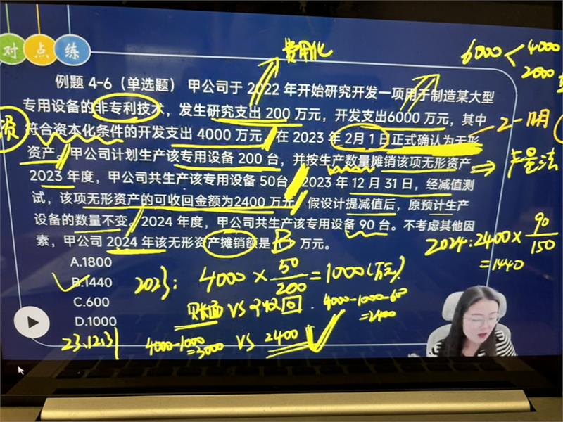 无形资产和固定资产在减值测试上处理方式一致。2023年需要考虑可收回金额2400万元,当账面价值高于可收回金额时需计提减值准备。