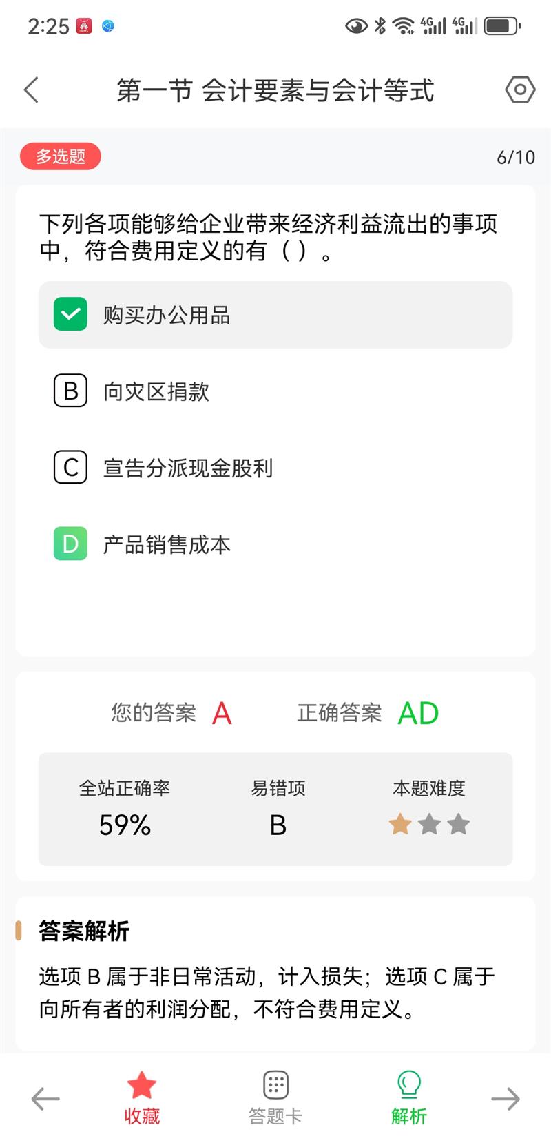 是的,营业外支出不属于费用。费用是企业在日常活动中发生的、会导致所有者权益减少的、与向所有者分配利润无关的经济利益的总流出。向灾区捐款属于企业非日常活动产生的损失,计入“营业外支出”,不符合费用的定义。