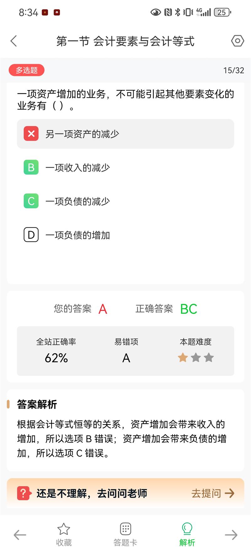 B 一项收入的减少:不可能发生,因为收入减少会减少所有者权益,若资产同时增加,等式无法平衡(资产增加通常对应收入增加,而不是减少)。