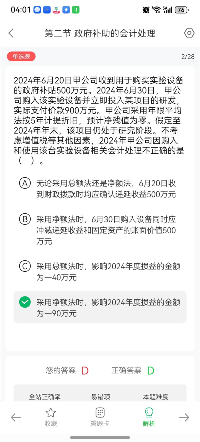 负数表示对损益的减少(即费用增加或收入减少)。 净额法下,固定资产按净额400万元入账,2024年折旧额 = 400/5×6/12 = 40万元,计入管理费用(借方),导致利润减少40万元,因此影响损益的金额为-40万元。 选项D的-90万元计算错误,故不正确。