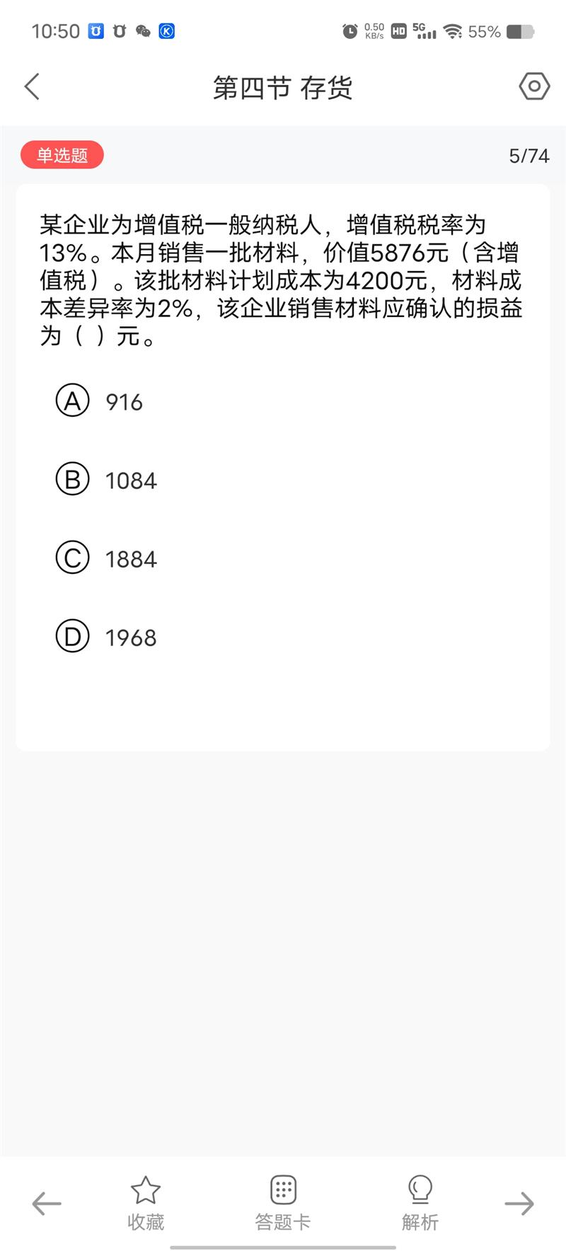 2. 计算材料实际成本: 计划成本4200元 × (1+材料成本差异率2%) = 4284元。差异率为正,表示实际成本超支。