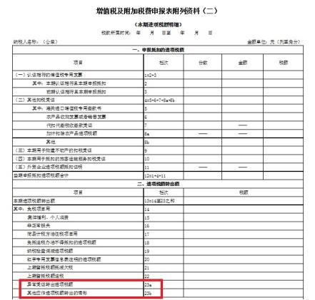 原《增值税纳税申报表附列资料(二)》(本期进项税额明细)第23栏“其他应作进项税额转出的情形”拆分为第23a栏“异常凭证转出进项税额”和第23b栏“其他应作进项税额转出的情形”,并将表名调整为《增值税及附加税费申报表附列资料(二)》(本期进项税额明细)。