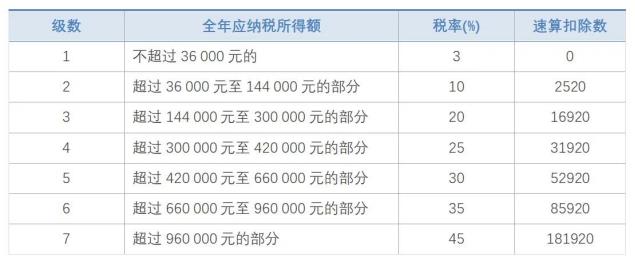 六、 年终奖个人所得税税率表(与上表同)年终奖不并入当年综合所得,以全年一次性奖金收入除以12个月得到的数额,按照按月换算后的综合所得税率表,确定适用税率和速算扣除数,单独计算纳税。居民个人取得全年一次性奖金,也可以选择并入当年综合所得计算纳税。自2022年1月1日起,居民个人取得全年一次性奖金,应并入当年综合所得计算缴纳个人所得税。