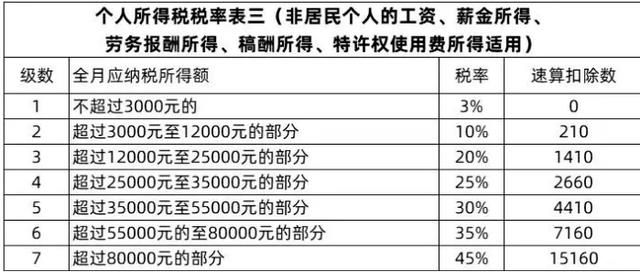 预扣率:居民个人工资、薪金所得预扣预缴税额的预扣率、速算扣除数,按照3%-45%七级超额累进税率执行。