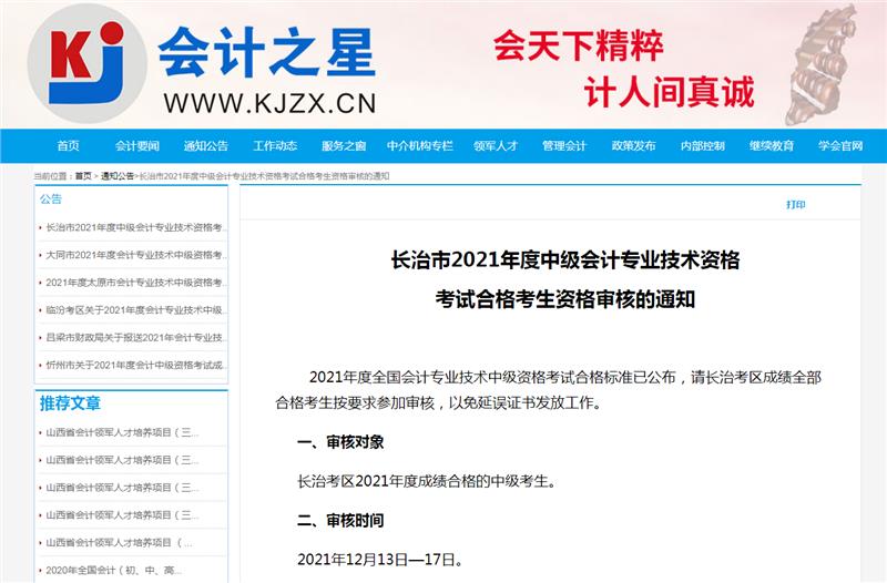 2021年度全国会计专业技术中级资格考试合格标准已公布,请长治考区成绩全部合格考生按要求参加审核,以免延误证书发放工作。