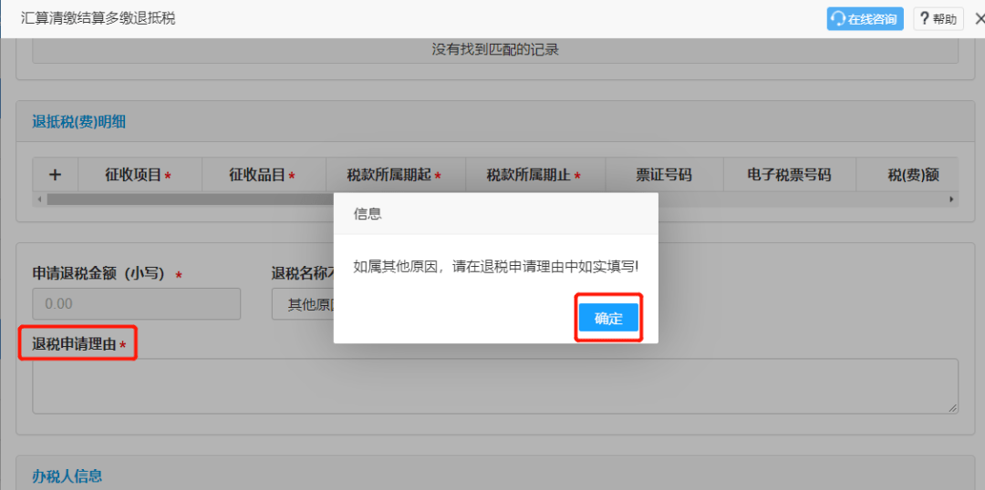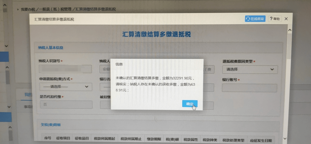 2 .进入 【汇算清缴结算多缴退抵税】办理界面,系统会提示“纳税人存在未确认的汇算清缴结算多缴,金额为XX元”,点击确定即可;