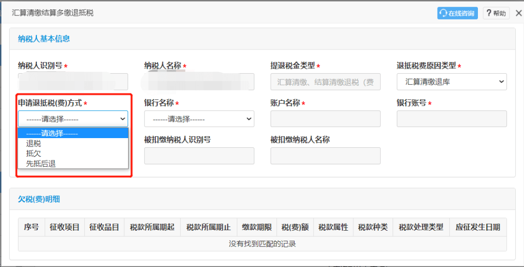 4 .选择 “申请退抵税(费)方式”,可选择“退税”、“抵欠”、“先抵后退”;