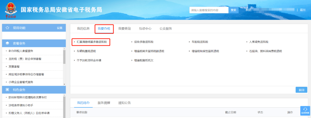 1.纳税人登录安徽省电子税务局,通过路径【我要办税】-【一般退(抵)税管理】-【汇算清缴结算多缴退抵税】或直接在搜索框搜索模块关键字进入模块办理;