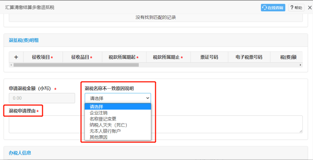 6 .对系统自动带出的汇算清缴结算多缴税款明细进行核对,同时若退税账户名称与退税纳税人名称不一致,需选择 “退税名称不一致原因说明”,可选择“企业注销”、“名称登记变更”、“纳税人灭失(死亡)”、“无本人银行账户”、“其他原因”,若选择为“其他原因”,还需在退税申请理由中如实、详细填写原因;若退税账户名称与退税纳税人名称一致,则无需对“退税名称不一致原因说明”进行选择;
