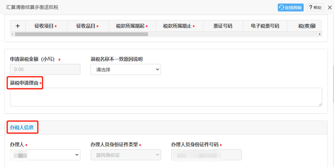 7 .以上退抵税信息核对无误后按照实际情况填写 “退税申请理由”,同时完善办税人信息,此信息为必填项,选择“办理人”后,系统会自动带出“办理人员身份证件类型”、“办理人员身份证件号码”;