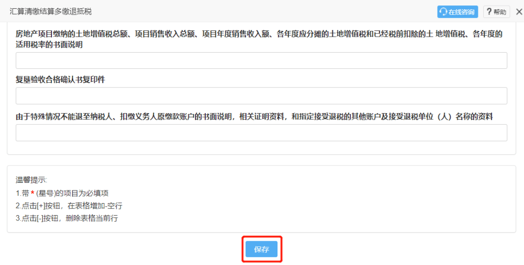8 .上传附报资料,核对汇算清缴结算多缴退抵税申请信息全部无误后,点击“保存”,即申请成功,等待税务局审核即可,同时需将纸质退抵税资料保存好留存备查。