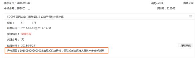 企业所得税年度申报回执显示:申报失败,系统级异常。
