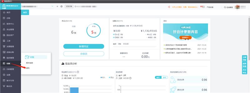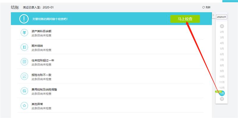 完成期末损益结转后,可以进入【结账】-【结账】界面,选中需要结账的月份,点击右上角【马上检查】,好会计会对结账期间做异常指标检查,如下图: