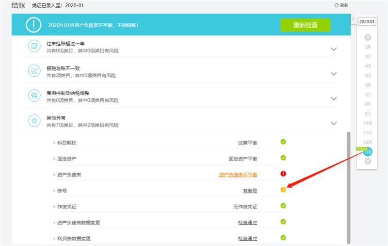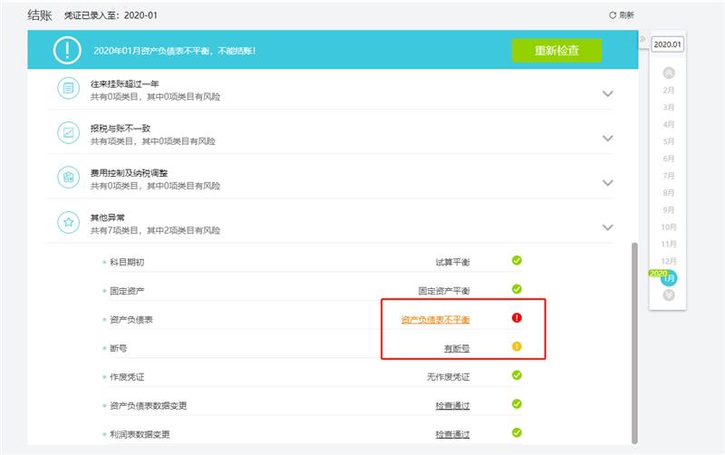 若检查有异常,会用黄色叹号或红色叹号标识出来。黄色叹号标识允许结账,但需人为判断是否重要,是否需要修改。红色叹号标识有严重异常,不允许结账,结账界面也不会出现【结账】按钮。如下图: