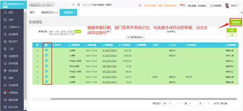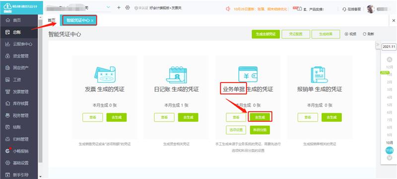 1、在【总账】-【智能凭证中心】-【业务单据生成凭证】,点击去生成,进入生成凭证界面,根据单据日期等条件查询,勾选需要生成凭证的单据,点击生成凭证,如图所示: