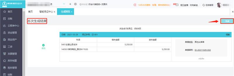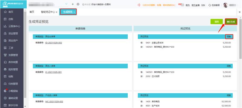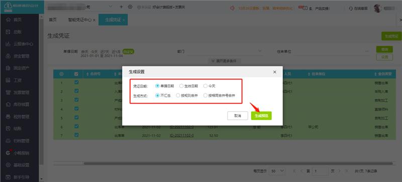 2、进入生成设置界面,设置好凭证日期和生成方式,点击生成预览,凭证预览界面可以调整凭证,如果没有问题,直接点击确认生成,生成凭证结果界面,点击完成即可;
