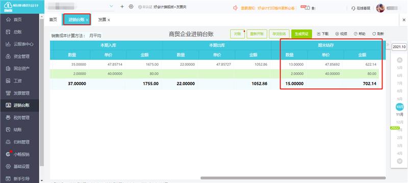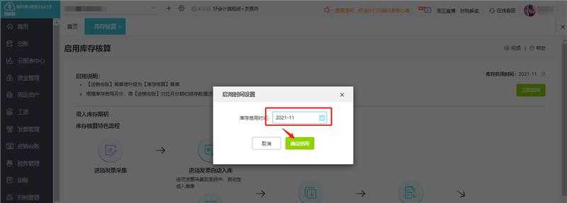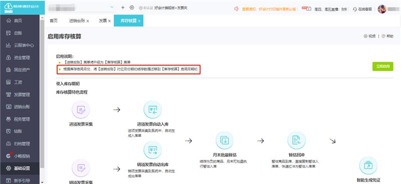 2.点击【基础设置】-【库存核算】,启用库存核算,选择库存启用时间,根据库存启用月份,将【进销台账】对应月份期初结存数据迁移到【库存核算】启用月期初,如图所示: