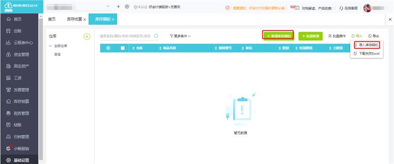 3.点击【基础设置】-【库存期初】,新增库存期初或者导入库存期初,如图所示: