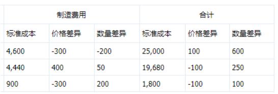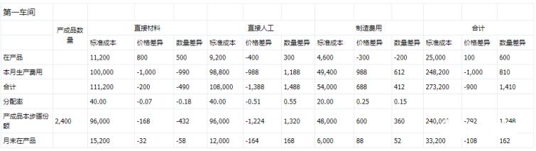 期初约当产量=100*50%+80+100=230件期末约当产量=200*60%+60+120=300件。所以当期约当完工的产量=2400+70=2470件。直接人工-价格差异=2470*4*(99000/10000)-2470*4*10=-988数量差异=(10000-2470*4)*9.9=1188标准成本=2470*40=98800制造费用-价格差异=2470*4*(51000/10000)-2470*20=988数量差异=51000-2470*4*5.1=612标准成本=2470*20=49400注:直接材料数量按照2400+380=2780件,直接人工和制造费用按照2400+300=2700件分配