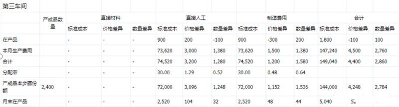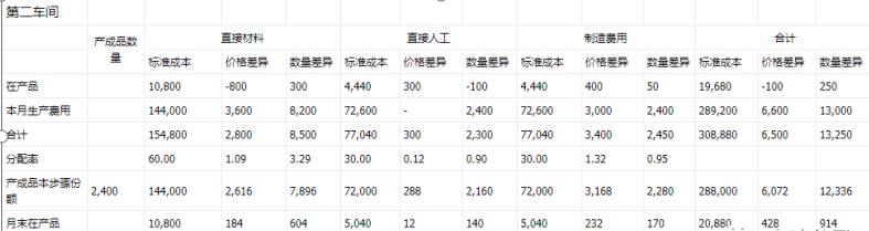 没有领用原材料,所以没有直接材料的成本直接人工和制造费用的约当产量=2400+120*70%-100*30%=2454件直接人工-价格差异=78000-75000=3000-数量差异=75000-2454*30=1380元-标准成本=2454*30=73620制造费用-价格差异=76500-7500*10=1500元-数量差异=7500-2454*30=1380元-标准成本=73620元注:直接人工和制造费用按照2400+120*70%=2484件分配