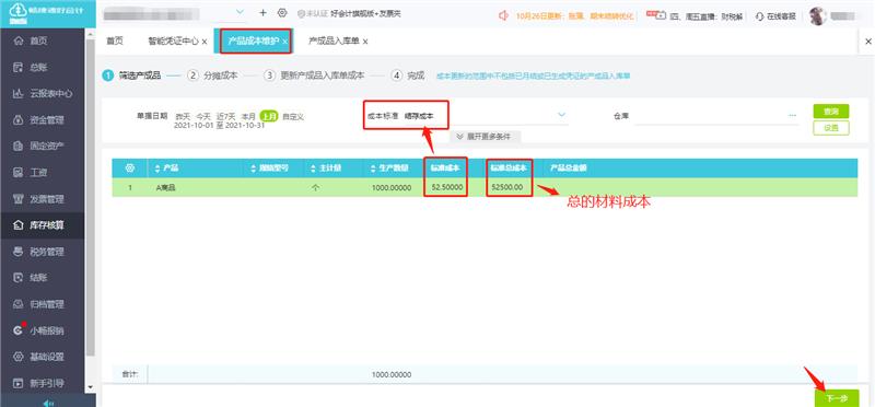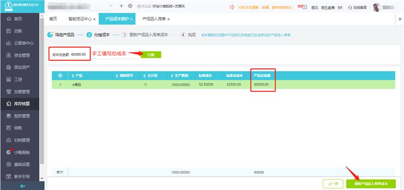 ②点击下一步,将总成本手工填写上去,总成本=直接人工+直接材料+制造费用