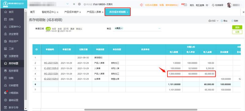 ③根据总金额分摊到入库成本中去:可以点击【库存核算】-【库存成本明细账】查看。