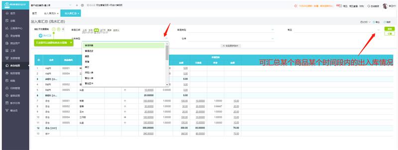 2 、出入库汇总:用于查询某一个时间段内存货的出库和入库汇总情况相当于单据统计