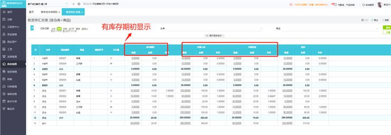 3、收发存汇总表:从商品统计商品的期初、入库、出库、结存情况,可以统计仓库+商品维护查看收发存情况。本库存报表便于库管人员查询商品总数量的账本。