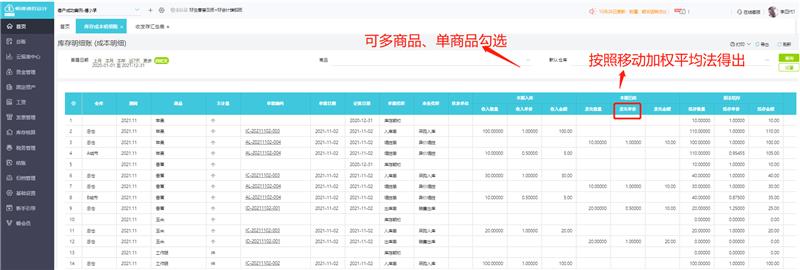 4、库存成本明细账:此库存账表主要是用于财务人员,管理成本核算来稽查商品的出、入、结存的数量、单价、金额情况,库存成本每一笔商品明细结存成本查看,账实要核对,如果没有核对上也就会出现盘盈盘亏等情况,便于工作的开展。