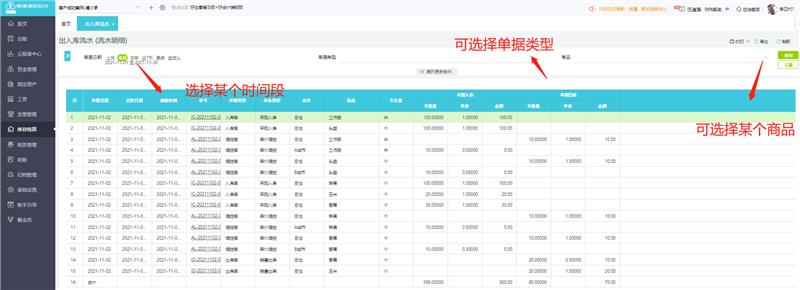 1 、出入库流水:用于查询某一个时间段内存货的出库和入库流水情况