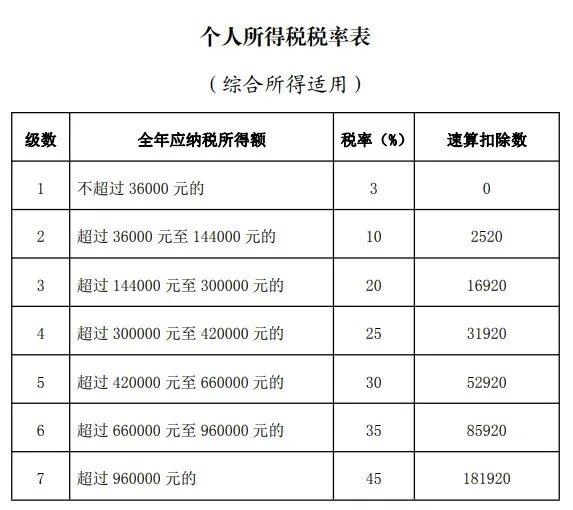 依据税法规定,2021年度终了后,居民个人(以下称“纳税人”)需要汇总2021年1月1日至12月31日取得的工资薪金、劳务报酬、稿酬、特许权使用费等四项所得(以下称“综合所得”)的收入额,减除费用6万元以及专项扣除、专项附加扣除、依法确定的其他扣除和符合条件的公益慈善事业捐赠(以下简称“捐赠”)后,适用综合所得个人所得税税率并减去速算扣除数(税率表见下图),计算本年度最终应纳税额,再减去2021年度已预缴税额,得出应退或应补税额,向税务机关申报并办理退税或补税。