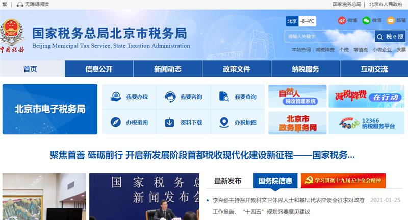 我们以“北京市”地税申报为例:http://beijing.chinatax.gov.cn ,其他地方也为同理,登录各地的“国家税务总局XX市税务局”网站。