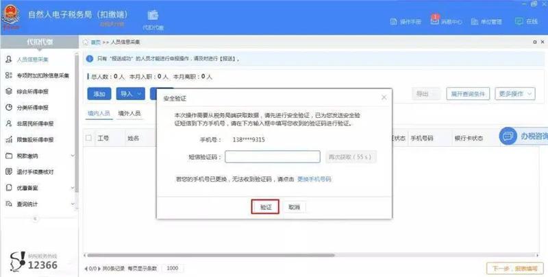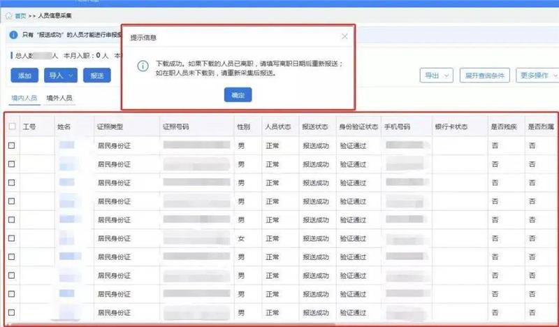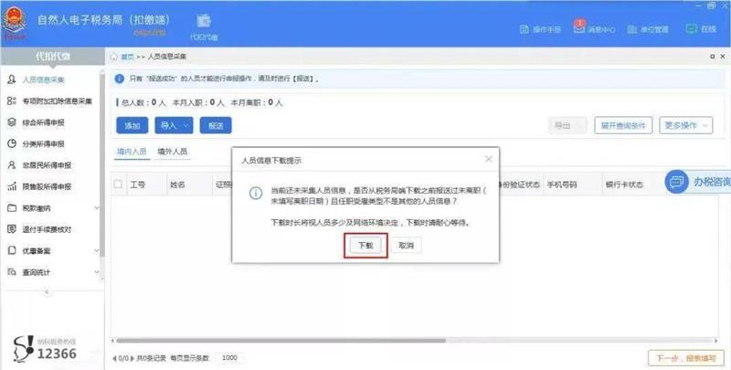 点击【人员信息采集】,若已提前开通【扣缴端数据下载】功能权限,系统会弹出如下提示,点击【下载】按钮即可从税务局端下载 “任职受雇从业类型”为“雇员”、“保险营销员”、“证券经纪人”和“实习学生(全日制学历教育)”,且未填写离职日期的纳税人,并通过实名办税信息手机号码进行短信验证。