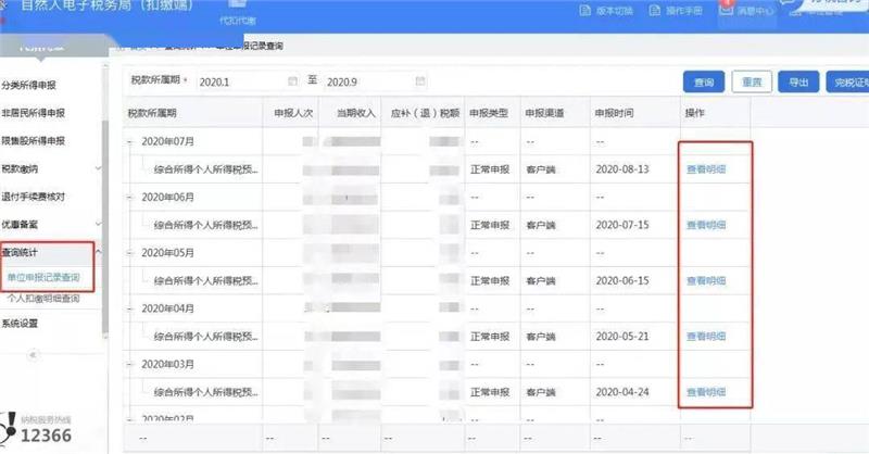 点击【查询统计】-【单位申报记录查询】-选择恢复月份的【查看明细】,并填写短信验证码,即可查看、下载往期个人所得税扣缴申报表。