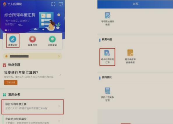 打开个人所得税APP,可从以下入口进入年度汇算:首页【常用业务】—【综合所得年度汇算】;或者首页【我要办税】—“税费申报”【综合所得年度汇算】。