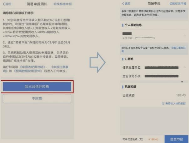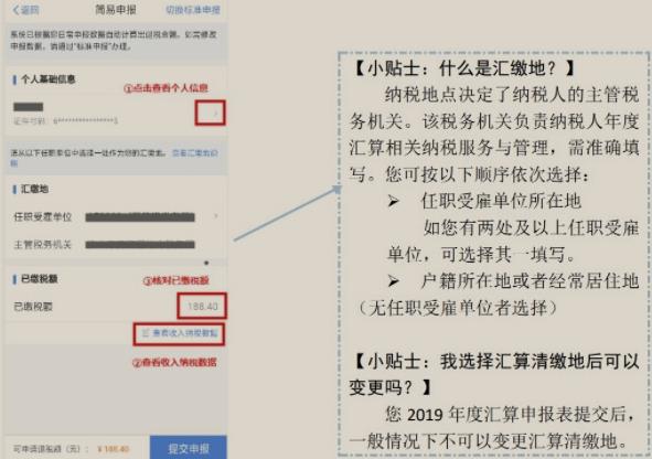 对综合所得年收入额不超过 6 万元的纳税人,进入系统后将看到“简易申报须知”提示,阅读后点击“我已阅读并知晓”进入简易申报界面,显示“个人基础信息”、“汇缴地”、 “已缴税额”等。